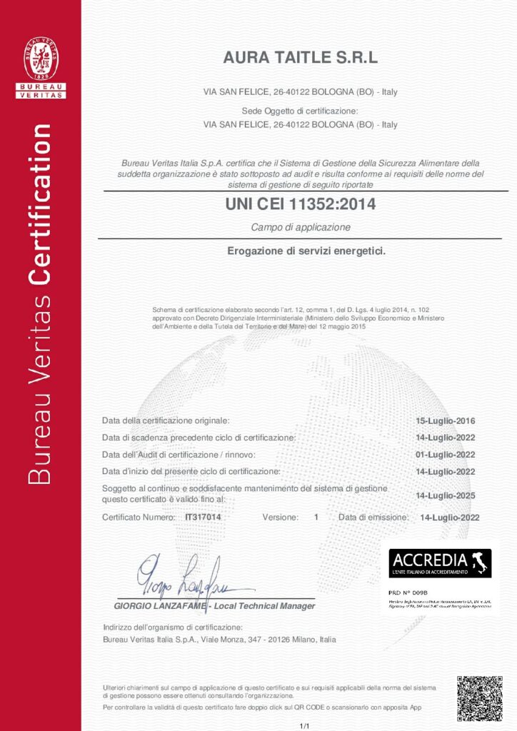 Nell’ottica di offrire un servizio più completo possibile, Aura Taitle è certificata come ESCo – Energy Service Company, secondo la normativa UNI CEI 11352:2014 per l’erogazione dei servizi energetici.